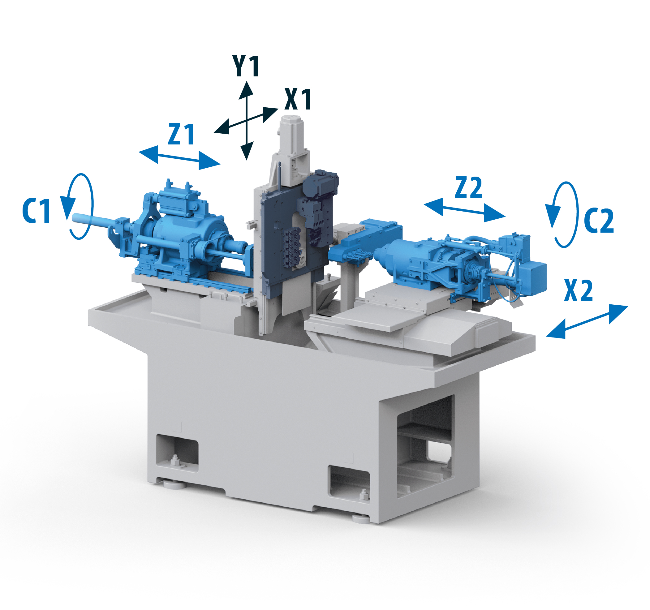 Up to 29 tools can be clamped simultaneously, which guarantees flexibility for different machining operations. The machine provides four linear axes (X1, Y1, Z1, Z2) and two rotary axes (C1, C2). Tool power of 2.2 kW and torque of 8 Nm enable efficient machining of a wide range of materials.