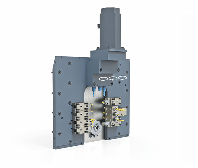 Counter spindle, powered tools are included in the basicmachine as well as the barloader. With 2 electrospindles, 3 powered tools, C-axis, and up to 12 fixed tools, the K’MX 413 is also able to run complex parts. With this machine, we want to offer an economical, reliable and easy solution. Four linear axes (X1, Y1, Z1, Z2), two rotary axes (C1, C2).