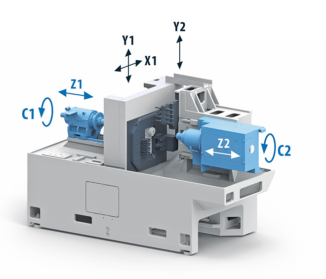 With a spindle bore diameter of 37 mm, no modification of the end of the bar for bar feeder collet is needed. The machine comes standard with two electro spindles, each with a maximum speed of 10,000 rpm and with a rotary guide bush, synchronized by pulleys and belts from the main spindle. Five linear axes (X1, Y1, Y2, Z1, Z2) two rotary axes (C1, C2). The machine is very strong when milling, with torque up to 32Nm!